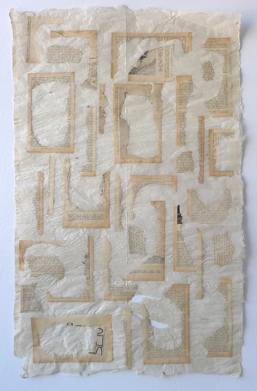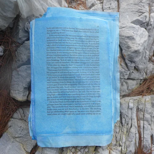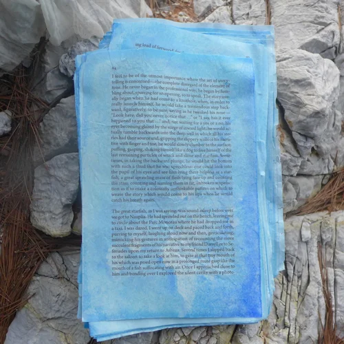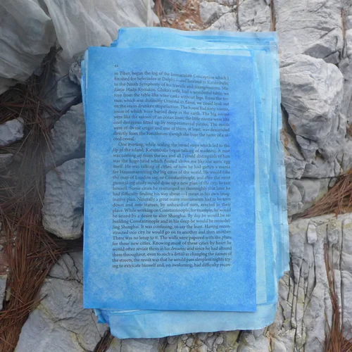 From Alter Texts in four parts at Bushwick Open Studios 2014. Text from Walden by Henry David Thoreau, blue paper, pennies, photograph.